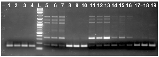PCR amplification using B-IF-for/B-IF-rev primers and DNA from both Russian (Acipenser gueldenstaedtii) and Siberian sturgeon (Acipenser baerii). Lanes 1–6 and 13–18 represent individual caviar grains DNA from the Siberian sturgeon (Acipenser baerii) grown at the EF, Florida, USA; lanes 7–8 represent caviar DNA from the Russian sturgeon grown in Israel, IF; lanes 9–10 represent caviar DNA from the Russian sturgeon grown at the MF, North Carolina, USA; lanes 11–12 represent caviar DNA from the Russian sturgeon grown at the EF, FL, USA. L: 2-log DNA ladder (NEB).