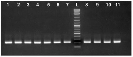 PCR amplification using B-IF-for/A ba 3411R primers. Lanes 1–3 represent individual caviar grains DNA from the Starry sturgeon (Acipenser stellatus) grown at the EF; lanes 4–5 represent caviar DNA from the Siberian sturgeon (Acipenser baerii) grown at the EF; lanes 6–7 represent caviar DNA from name the Russian sturgeon (Acipenser gueldenstaedtii) grown at the EF; lanes 8–9 represent caviar DNA from the A. gueldenstaedtii grown at the MF; lanes 10–11 represent caviar DNA from the A. gueldenstaedtii grown in Israel. L: 2-log DNA ladder (NEB).