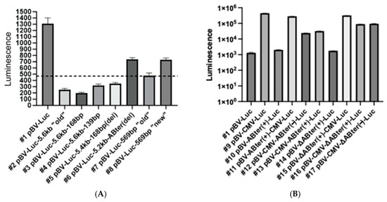 There are a total of 18 different plasmids (construct #18 has EGFP under control of the HCMV-IE promoter to monitor the transfection efficiency) that were used for transfection. ABter cloning into pBV-Luc generated luciferase expression numbers almost two times higher than pBV-Luc alone (average of 2029 U vs. 1306 U). The cloned HCMV-IE promoter sequence increased luciferase expression more than 200 times in comparison to the pBV-Luc plasmid without the promoter. The ABter domain cloned before HCMV-IE resulted in an approximately 1.6-fold reduction in luciferase expression, while the same sequence cloned after HCMV-IE reduced expression much more efficiently. Importantly, both orientations of the cloned ABter sequence exhibited a decrease in the luciferase expression by approximately 19 and 14-fold for the (−) and (+) strands, respectively. Similar cloning of the ∆ABter domain before HCMV-IE decreased luciferase expression by approximately 1.4 times. The same sequence cloned after HCMV-IE reduced luciferase expression only by 5.0 and 4.7 times for the (−) and (+) strands, respectively (Figure 9B).