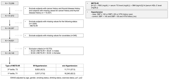 The METS-IR was calculated using the following formula: ln [(2 × FBG + TG) × BMI]/ ln [HDL-C]. This score was categorized into tertiles for the analysis. The division into tertiles was chosen to balance granularity and statistical power, ensuring sufficient differentiation among low-, moderate-, and high-metabolic-risk groups while maintaining robust sample sizes. A binary division would oversimplify metabolic risk, and dividing into more than three groups could reduce subgroup sizes and statistical significance. This approach effectively captures group-specific genetic effects and provides clearer insights into the interaction between metabolic risk and hypertension. For our analysis, we limited the sample to participants without a history of cancer or thyroid disease to minimize the potential confounding effects related to hypertension. Furthermore, we excluded 1951 individuals with missing data on the METS-IR index and other covariates. The remaining participants were categorized into three groups based on their METS-IR tertiles. For this study, we selected participants from the first tertile (T1), defined as METS-IR < 34.22 in males and <30.94 in females, and the third tertile (T3), defined as METS-IR ≥ 39.25 in males and ≥35.93 in females. A total of 40,148 participants were included in the final analysis. This cohort comprised 3517 participants with hypertension, 16,240 without hypertension at T1, 8653 with hypertension, and 11,711 without hypertension at T3. A flowchart of the study population is shown in Figure 1.
