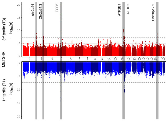 Miami plots. The results of the genome-wide association study (GWAS) analyzing the risk of hypertension prevalence in the first tertile (T1, blue graph) and third tertile (T3, red graph) groups based on METS-IR are presented in the Miami plots. The horizontal axis represents the position of SNPs across chromosomes 1 to 22, and the vertical axis shows the −log10 transformation of the p-values for hypertension associations. The solid line marks the genome-wide suggestive significance threshold (p-value < 1 × 10−5), and the dotted line indicates the genome-wide significance threshold (p-value < 5 × 10−8). Four regions (chr2p24, chr2q24.3, ATP2B1, and chr20p12.2) highlighted in gray show significant associations specific to the METS-IR T3 group, whereas the FGF5 and ALDH2 regions exhibit significant associations in both the T1 and T3 groups.