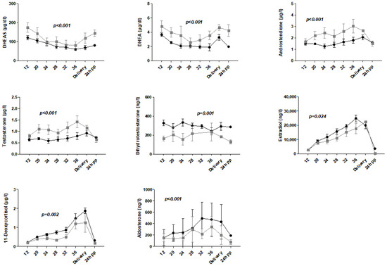 Concentration versus time course of DHEAS, DHEA, androstenedione, testosterone, dihydrotestosterone, estradiol, 11-deoxycortisol and aldosterone in women with preeclampsia (gray line with squares; mean ± SEM) and controls (black line with circles; mean ± SEM). X-axis: time (12, 20, 24, 28, 32 and 36 WGA, day of delivery and 24 h postpartum). Steroid comparisons between preeclamptic and healthy groups were calculated using Student’s t-test or Kruskal–Wallis test. The level of significance was 0.05. DHEAS, dehydroepiandrosterone sulfate; DHEA, dehydroepiandrosterone; pp, postpartum; SEM, standard error of the mean.