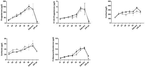 The concentration versus time courses of the mean serum concentrations of progesterone, 17-OH progesterone (17-OHP), cortisol, cortisone and 11-deoxycorticosterone were similar between the women with preeclampsia and controls (Figure 2).
