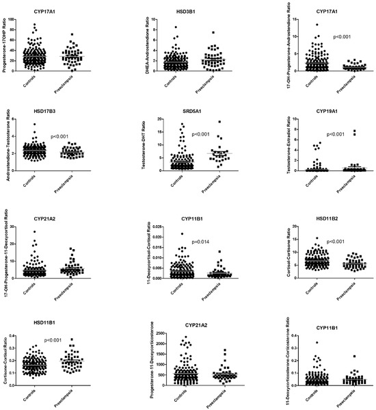 Steroid-metabolizing enzymes, precursors, products and precursor-to-product ratios of steroid-metabolizing enzymes in women with preeclampsia and in controls.
