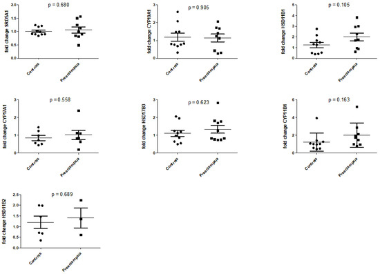 mRNA expression of steroid-metabolizing enzymes in serum of women with preeclampsia and of controls at WGA 24 and 28. Each dot represents an available sample of the 9 enrolled preeclamptic women and 36 healthy controls at WGA 24 and 28. SRD5A1, 5α-reductase; CYP19A1, aromatase; HSD11B1, steroid 11β-hydroxylase; CYP17A1, steroid 17α-hydroxylase; HSD17B3, 17β-hydroxysteroid-dehydrogenase; CYP11B1, steroid 11β-hydroxylase; HSD11B2, 11β-hydroxysteroid dehydrogenase 2.