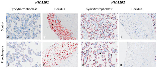 Placental protein expression of HSD11B1 and HSD11B2 in women with preeclampsia and controls. Epitopes of HSD11B1 and HSD11B2 were stained in red. HSD11B1 was expressed in the cytoplasm of maternal decidua cells (black arrow in (B,F)), while HSD11B2 was expressed in the fetal syncytiotrophoblast. The placental tissue shows uninterrupted staining on the outer surface of the villous tree (black arrow in (C,G)). There is no labelling for HSD11B1 in the syncytiotrophoblast (A,E) and no visualization of HSD11B2 in decidua cells (D,H).