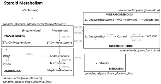 Steroid metabolism, adapted from [51]. Sources of the respective steroid class are shown in italics. Steroids in brackets were not measured in this study. Metabolizing-enzymes are shown in gray and are en-coded by the gene of the same name. CYP17A1, steroid 17α hydroxylase; HSD17B3, 17β-hydroxysteroid-dehydrogenase; SRD5A1, 5α-reductase; CYP19A1, aromatase; HSD3B1, 3β hydroxysteroid dehydrogenase; CYP21A2, steroid 21-hydroxylase; CYP11B1, steroid 11β-hydroxylase; HSD11B2, 11β-hydroxysteroid dehydrogenase 2, HSD11B1, 11β-hydroxysteroid dehydrogenase 1.