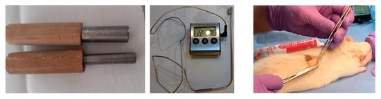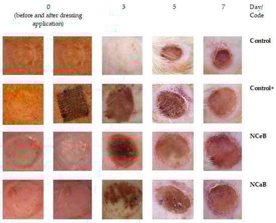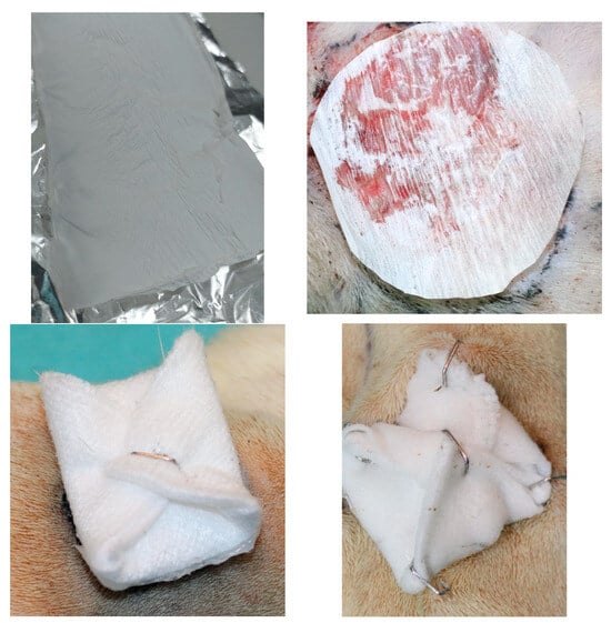 - Group 2 (Control+): positive reference, covering the wound with a commercial patch (Atrauman Ag®, Heidenheim, Germany—polyamide fibers impregnated in triglycerides and silver particles)