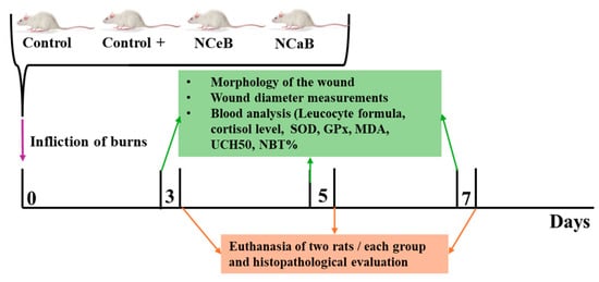 - Group 4 (NCaB): wound covered with NCaB nanofibers (low concentration norfloxacin, 0.94%)