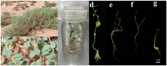 Effects of polyethylene glycol (PEG) on the growth and morphology of A. camelorum. (a) Representative photograph of A. camelorum thriving in its natural desert habitat, showcasing the plant’s adaptation to arid conditions. (b) Close-up view of A. camelorum in the desert, highlighting the plant’s structural features that enable survival in extreme environments. (c) Growth of A. camelorum from seeds on Murashige and Skoog (MS) medium within a plant culture bottle, demonstrating the plant’s ability to germinate and grow under controlled conditions. (d) Solvent control, illustrating the baseline growth without PEG treatment. (e–g) Progressive increase in PEG concentration treatments: (e) 1% PEG, (f) 5% PEG, and (g) 10% PEG, showing the differential responses of A. camelorum to osmotic stress induced by varying PEG concentrations. Scale bar represents 1 cm.