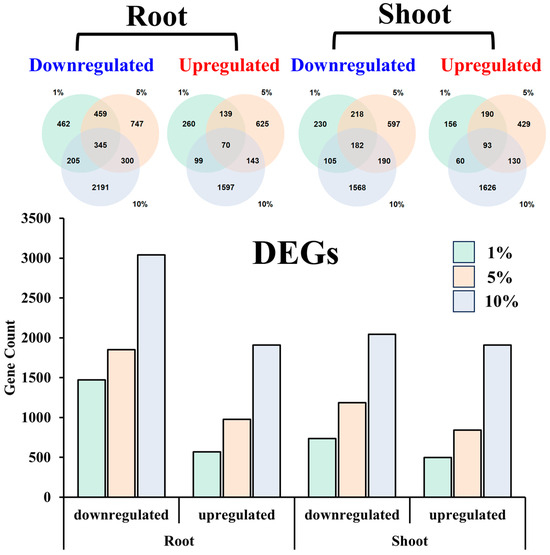 Among the 17,159 mapped genes (Table S1), our differential expression analysis revealed a significant increase in the number of DEGs in both root and shoot tissues as the concentration of PEG increased (Figure 2). This trend was consistent for both downregulated and upregulated DEGs. Specifically, in the root tissue treated with 1% PEG, we identified 1471 downregulated genes, which increased to 1851 in the 5% PEG treatment, and further to 3041 in the 10% PEG treatment. Similarly, the number of upregulated genes in the root tissue increased from 568 in the 1% PEG treatment to 977 in the 5% PEG treatment, and to 1909 in the 10% PEG treatment.