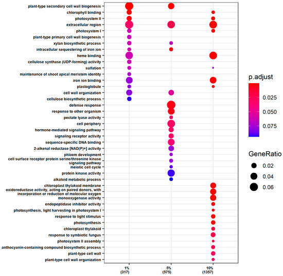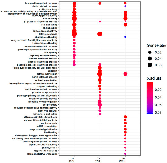 The upregulation of gene expression in the shoot tissues also displayed a concentration-dependent enrichment profile (Figure 4). At 1% PEG, the DEGs were enriched in processes associated with the extracellular region and plant-type secondary cell wall biogenesis, as well as in chlorophyll binding and photosystem II. At 5% PEG, the enrichment of upregulated DEGs extended to defense response and plant-type secondary cell wall biogenesis, suggesting a reinforcement of the cell wall and defense mechanisms to protect against the increasing stress. At 10% PEG, there was a pronounced enrichment in pathways related to photosynthesis and plant cell wall biosynthesis and organization. This included processes associated with the extracellular region, chlorophyll binding, photosystem I and II, heme binding, chloroplast thylakoid membrane, response to light stimulus, photosynthesis, photosystem II assembly, anthocyanin-containing compound biosynthetic process, plant-type cell wall, and plant-type cell wall organization.