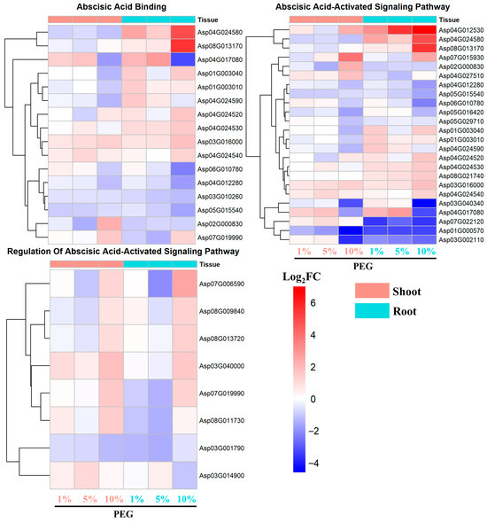 In the root tissues, the upregulation of genes involved in ABA binding was more pronounced and robust compared to the shoot tissues (Figure 5). Notably, genes such as Asp04G024580 and Asp08G013170 consistently showed upregulation across 1%, 5%, and 10% PEG treatments. Hierarchical clustering analysis grouped these genes together, indicating a coordinated response to osmotic stress. The expression fold changes (Log2FC) for Asp04G024580 and Asp08G013170 reached as high as 4.9 and 5.5, respectively.