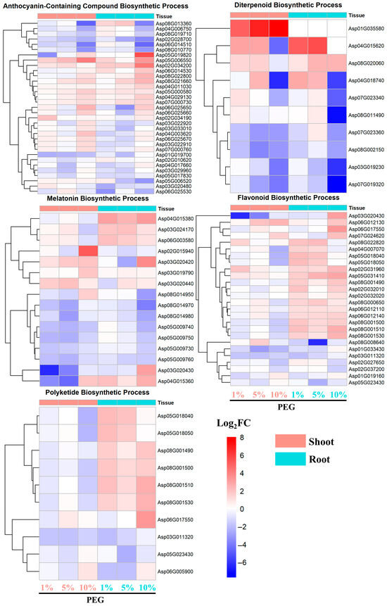 Likewise, the upregulation of genes in the flavonoid biosynthetic process was predominantly observed in the root tissue, with a noticeable increase in expression under all PEG concentrations, peaking under 10% PEG induction. The most significant upregulation was observed for Asp06G017550, with a Log2FC of 3.3. Similar to the flavonoid biosynthetic process, genes in the polyketide biosynthetic pathway were predominantly upregulated in the root tissue, with increasing expression levels as PEG concentration increased. The highest Log2FC values were observed for Asp06G017550, Asp08G001530, and Asp08G001510, with values of 3.3, 2.5, and 2.7, respectively.