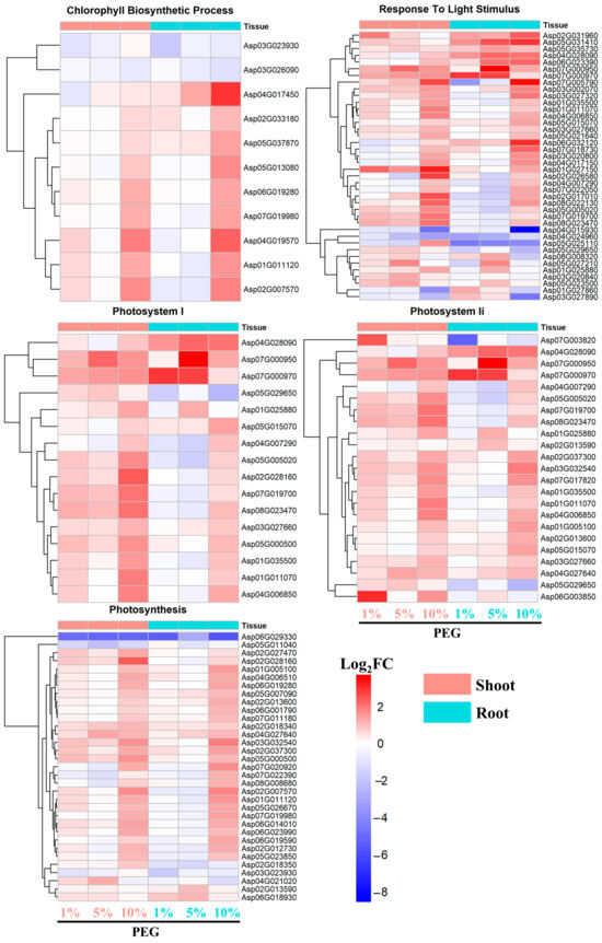 In the ABA-activated signaling pathway, Asp04G012530, encoding an ethylene-responsive transcription factor ABI4, showed increased expression with PEG concentration, reaching a log2FC of 7. Asp04G017080, encoding an abscisic acid receptor PYL6, showed log2FCs of 2 and 2.8 at 1% and 5% PEG, respectively, but was downregulated to −3.2 at 10% PEG. For cell wall biogenesis and organization, Asp02G012850 and Asp07G026350, encoding cellulose synthase, had the highest log2FC of 3.3 and 2.7 in shoot tissues at 5% PEG. Asp02G019480 and Asp04G004030, encoding expansins, showed log2FC of 4.4 and 3.8 in shoot tissues under 10% PEG treatment (Figure 10). In the photosynthesis-related category, Asp04G028090, encoding a chlorophyll a-b binding protein, was notably upregulated in root tissues with a log2FC of 2.2 at 5% PEG. Shoot-specific upregulation was seen in Asp07G003820 and Asp06G003850, encoding photosystem II protein D1, with log2FC of 2.4 and 3, respectively. Likewise, Asp02G028160, Asp02G017010, and Asp08G022130, encoding photosystem I reaction center subunit N and protein LIGHT-DEPENDENT SHORT HYPOCOTYL 6, had log2FC of 2.4, 2.5, and 2.3 in the shoot, respectively. In secondary metabolite biosynthesis, Asp03G028190 and Asp04G015620, which encode beta-amyrin 28-monooxygenase isoform B and linalool synthase, showed the highest log2FC of 4.6 and 5.6 in roots.