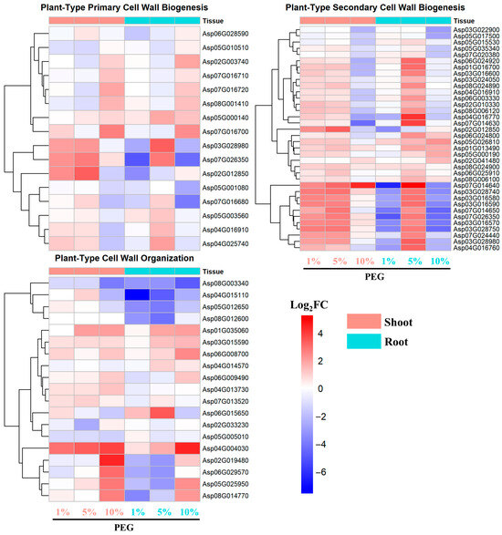Genes related to plant-type cell wall organization responded similarly in both root and shoot tissues. Their expression levels increased with the increase in PEG concentration, reaching the highest levels under 10% PEG stress. Notably, genes such as Asp04G004030 and Asp02G019480 showed the most significant upregulation, with Log2FC values approaching 4, suggesting a critical role in the plant’s structural adaptation to osmotic stress (Figure 8).
