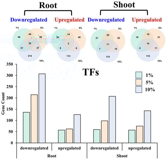In the shoot tissue, the downregulated DETFs shared among the three PEG concentrations were 11, while the unique sets for each treatment were not specified. For the upregulated DETFs in the shoot, the commonality was limited to 14 genes, with unique sets of 16, 31, and 110 DETFs under 1%, 5%, and 10% PEG, respectively.
