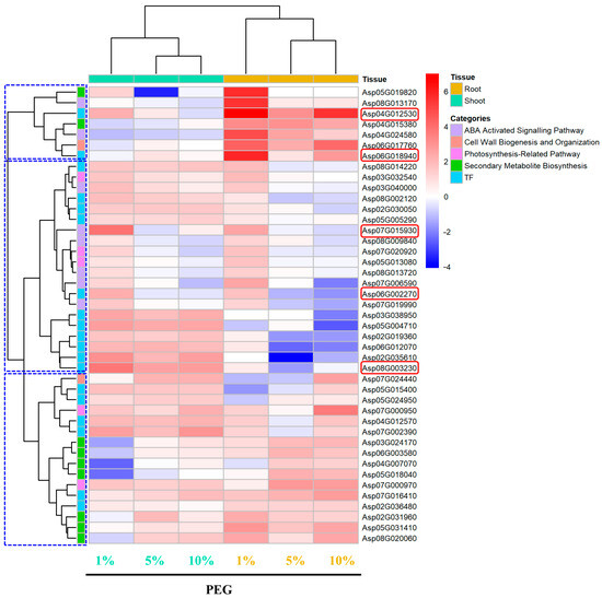 The regulation of ABA-activated signaling pathway genes showed a distinct pattern, with upregulated genes predominantly induced under the 10% PEG condition, as compared to 1% and 5% PEG treatments (Figure 5). These genes were similarly induced in both root and shoot tissues, suggesting a systemic response to the highest osmotic stress level. The genes such as Asp07G006590, Asp08G009840, Asp08G013720, Asp03G040000, and Asp07G019990 exhibited a coordinated upregulation, indicative of a heightened regulatory response to severe drought conditions.