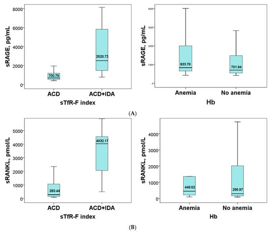Previously, our group reported that sRAGE, sRANKL, and OPG are associated with iron metabolism, disease activity, and autoimmune status in RA [,]. There are insufficient studies in the literature as to whether the type of anemia and the changes in iron homeostasis are associated with bone metabolism controlled by OPG, RANKL, and RAGE. We were interested in investigating whether the levels of the soluble receptors sRANKL, sRAGE, and OPG are affected by the distribution of RA patients in subgroups according to sTfR-F index and hemoglobin levels and in examining their correlation with indicators of iron metabolism, disease activity, and autoimmune and inflammatory changes in these subgroups. Such a study would provide additional information for predicting bone disorders in states of anemia of inflammation and the combined type of anemia in RA.