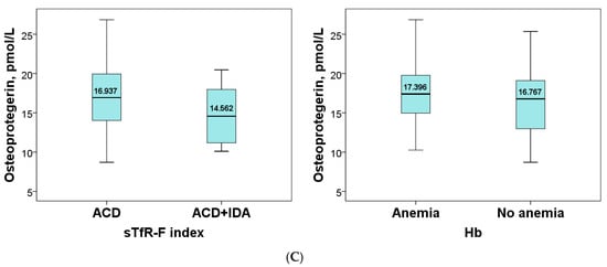 The serum levels of the soluble receptors (sRAGE, sRANKL, and OPG) according to sTfR-F index value and the level of hemoglobin are shown in Figure 1. The comparison of the soluble receptor content according to the sTfR-F index showed that the levels of sRAGE and sRANKL were significantly higher in the subgroup with combined anemia (ACD/IDA) compared to the ACD subgroup: p < 0.0001 and p < 0.0001. The level of OPG tended to decrease in ACD/IDA (p = 0.053). The distribution of patients according to Hb level did not result in statistically significant differences in sRAGE, sRANKL, and OPG levels between the two subgroups (Figure 1A–C).