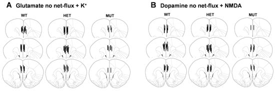 Cartoon of the location of the active membranes of the microdialysis probes of wild-type (WT), heterozygous mutant (HET), and homozygous mutant (MUT) mice in the study of (A) K+-evoked neurotransmitter release and glutamate no net-flux and (B) NMDA-evoked neurotransmitter release and dopamine no net-flux.