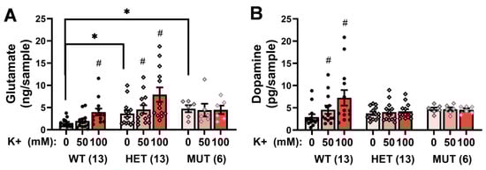 Comparison of the effects of perfusion of K+ solutions (0, 50, and 100 mM) into the mPFC of wild-type (WT), heterozygous mutant (HET), and homozygous mutant (MUT) mice on (A) extracellular levels of glutamate and (B) extracellular levels of dopamine. The data represent the means +/− SEMs of the number of mice indicated in parentheses. * p < 0.05 vs. WT (Genotype effect; SNK post-hoc tests); # p < 0.05 vs. 0 mM (K+ effect; corrected t-tests).