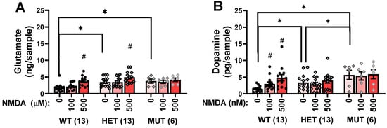 Comparison of the effects of perfusion of NMDA-containing solutions (0, 100, and 500 μM) into the mPFC of wild-type (WT), heterozygous mutant (HET), and homozygous mutant (MUT) mice on (A) extracellular levels of glutamate and (B) extracellular levels of dopamine. The data represent the means +/− SEMs of the number of mice indicated in parentheses. * p < 0.05 vs. WT (Genotype effect; SNK post-hoc tests); # p < 0.05 vs. 0 mM (NMDA effect; corrected t-tests).