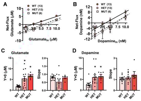 Summary of the results of the no net-flux microdialysis experiments in which (A) glutamate and (B) dopamine were perfused into the mPFC of wild-type (WT), heterozygous mutant (HET) and homozygous mutant (MUT) mice. (C) Comparison of the x-intercept (y = 0; estimate of basal neurotransmitter content) for glutamate (left) and the slopes of the linear regression for the glutamate study (reflection of clearance/reuptake; right) between WT, HET, and MUT mice. The data in panel C is derived from panel A. (D) Comparison of y = 0 (left) and the slopes of the linear regressions (right) from the dopamine study. The data in panel D are derived from panel B. The data represent the means +/− SEMs of the number of mice indicated in parentheses. * p < 0.05 vs. WT (Genotype effect; SNK post-hoc tests).