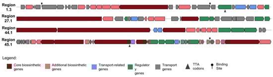 - Blin, K.; Shaw, S.; Augustijn, H.E.; Reitz, Z.L.; Biermann, F.; Alanjary, M.; Fetter, A.; Terlouw, B.R.; Metcalf, W.W.; Helfrich, E.J.N.; et al. antiSMASH 7.0: New and improved predictions for detection, regulation, chemical structures, and visualisation. Nucleic Acids Res. 2023, 51, W46–W50. [Google Scholar] [CrossRef]
