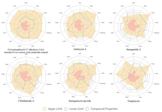 - Durán-Iturbide, N.A.; Díaz-Eufracio, B.I.; Medina-Franco, J.L. In silico ADME/Tox profiling of natural products: A focus on BIOFACQUIM. ACS Omega 2020, 5, 16076–16084. [Google Scholar] [CrossRef]
