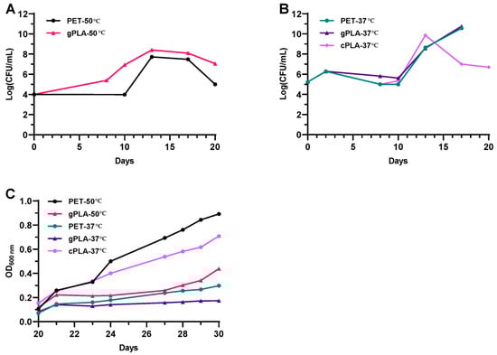 Microbial biomass measurements. (A) CFU counting of cultures enriched at 50 °C on post-consumer PET (PET-50 °C) and virgin PLA granules (gPLA-50 °C), from 0 to 20 days after inoculum. (B) CFU counting of cultures enriched at 37 °C on post-consumer PET (PET-37 °C), virgin PLA granules (gPLA-37 °C), and post-consumer PLA cups (cPLA-37 °C), from 0 to 20 days after inoculum. (C) OD600nm measurement of the enrichment cultures after the second medium replacement (i.e., 20th day).