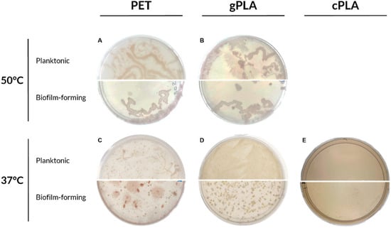 Both planktonic and biofilm-forming microbiomes enriched at 50 °C reported limited morphological differences (Figure 2A,B). Additionally, a modest morphological variation was noted between PET-50 °C (Figure 2A) and gPLA-50 °C (Figure 2B) microbiomes. Despite the enrichment on different plastic polymers, the higher temperature promoted the selection of morphologically similar swarming bacteria. Conversely, microbiomes enriched on PET or PLA at mesophilic conditions (Figure 2C–E) exhibited a greater degree of morphological diversity. For instance, in the PET-37 °C consortium (Figure 2C), an evident morphological difference is appreciable within the planktonic and biofilm-forming communities, showing red fusiform colonies embedded in the solid medium, as well as punctiform and expanse colonies. This can be attributed to the source of the inoculum, which originated from a WWTP operating under mesophilic conditions; thus, at 37 °C, more members of the initial inoculum could survive to selection and proliferate. Moreover, the microbiomes enriched on the three different polymers exhibited distinctive morphological characteristics, indicating that the plastic polymer exerted a greater influence on selection than temperature.