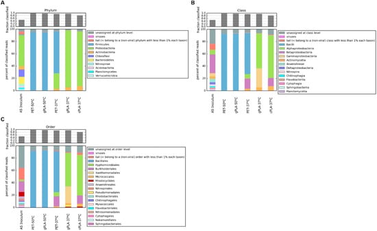 Metagenomic analysis was conducted to elucidate changes in the composition of microbial communities and to evaluate the presence of microorganisms and protein coding sequences associated with polyester degradation. Genomic DNA from both the initial AS and the enriched microbiomes was subjected to sequencing, yielding an average read count of approximately 30 million base pairs per sample. The raw reads in the AS, as well as in the enriched microbiomes, were assigned almost entirely to Bacteria. A total of nine phyla were found in the AS sample (Figure 3A), with the predominance of Proteobacteria, accounting for 50% of all the taxa assigned. The less dominant phyla included Bacteriodetes (13%), Chloroflexi (12%), Actinobacteria (5%), and Firmicutes (1%), which is in accordance with other studies of AS microbial composition in the literature []. A discrepancy between the sample and the literature was observed regarding the proportion of reads assigned to Archaea and Eukarya. In reference data, this proportion is approximately 10%, while in our sample, it is reduced to ≈1%. This discrepancy could be due to differences in the sequencing depth. Regarding the samples enriched at 50 °C, it is evident that temperature exerted a significant influence on the selection process, rather than the polymer composition. This is evident also by looking to a similar total n° of ORFs and the similar type of enrichment (≈nine times) of putative PLA/PET polyester degrading enzymes in 50 °C samples treated with different types of polyesters, if compared to the reference AS left at 37 °C (Table 2). Indeed, the two microbiomes exhibited a shared taxonomic profile, characterized by the enrichment of the Bacillales order (Figure 3C). The latter contains strains characterized for the degradation of PET and predominantly PLA []. Specifically, 20% of the PLA-active enzymes (PLAse) in the PAZy [] and PlasticDB [] databases were retrieved from members of the Bacillales order.