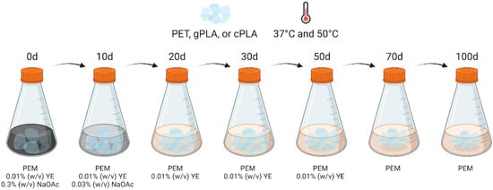 Abiotic controls were set up for each polymer by replacing the microbial inoculum with sterile PEM-AY supplemented with 0.05% (w/v) of sodium azide. The enrichment cultures, as well as the abiotic controls, were incubated at 37 °C and 50 °C under a constant shaking rate of 100 rpm, to promote the selection of mesophilic and mildly thermophilic microbial communities (i.e., microbiomes). Then, the nutrient content of the medium was gradually reduced over time, as described in Kim et al. (2017) [], with minor modifications. The spent medium was aseptically removed from each flask using a serological pipette, and 300 mL of fresh medium was added (Figure 4).