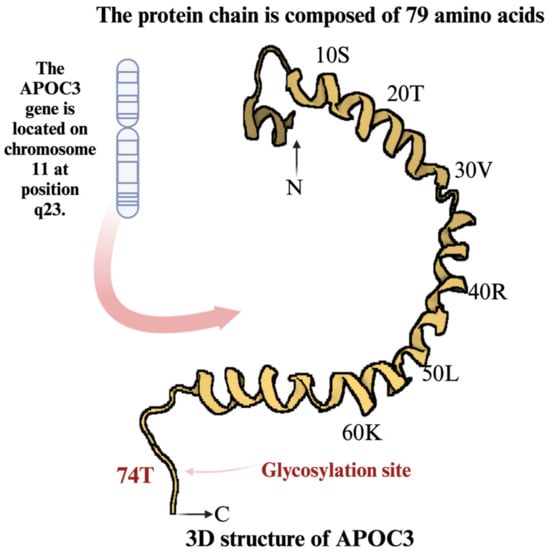 In the course of diabetes, the risk of cardiovascular diseases (CVDs) increases by 1.38 times, and mortality rates rise by 1.86 times [1]. However, many studies show that merely controlling blood glucose levels in patients with diabetes is insufficient in effectively improving CVD risk [2,3]. Patients with diabetes are more susceptible to the development of CVD owing to a number of factors besides glucose, including smoking, high blood pressure, dyslipidemia, obesity, abdominal fat, chronic renal disease, and a family history of heart disease [4]. Several studies have suggested that apolipoprotein C3 (APOC3, Figure 1) plays a significant role in the development of CVD in patients with diabetes [5,6].