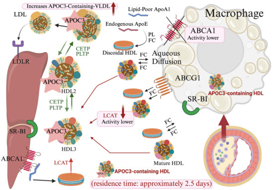 In healthy individuals, APOC3-containing HDL comprises approximately 6%–13% of total HDL [68,69]. This subtype also includes electronegative HDL (H5), which is highly expressed in inflammatory states, such as in Alzheimer’s disease, and is associated with enhanced inflammatory responses in cells [70,71]. Specifically, APOC3-containing HDL has been linked to increased carotid intima-media thickness (cIMT), a key marker of cardiovascular risk. Interestingly, HDL lacking APOC3 shows opposing trends in APOA-I expression. This has led to a hypothesis that the neutral association of total APOA-I with cIMT results from the presence of two HDL subtypes with counteractive effects. Furthermore, when adjusted for TG and total APOB levels, the association between APOC3 and cIMT is no longer significant, whereas APOC3 within HDL remains significantly associated, suggesting its independent impact on cIMT [72]. Another critical feature of APOC3-containing HDL is its extended circulatory half-life, approximately 2.5 days longer than HDL lacking APOC3, potentially accelerating the progression of CVD [73]. The function of APOC3 within HDL is believed to depend on the adenosine triphosphate-binding cassette transporter A1 (ABCA1) pathway, which facilitates cholesterol efflux from macrophages. Studies with ABCA1-deficient mice (ABCA1−/−) have shown impaired formation of APOC3-containing HDL, resulting in APOC3 accumulation primarily on VLDL particles [74,75]. Reduced ABCA1 activity, as observed in T2DM, limits cholesterol transport from cells to small HDL particles, contributing to hypertriglyceridemia even at low plasma APOC3 levels, emphasizing the importance of ABCA1 in lipoprotein metabolism and cardiovascular health [76]. In individuals with APOC3 variants, an increase in HDL-C levels coincides with lifelong reductions in plasma TG and APOC3 levels, which are linked to lower CHD risk (Figure 3).