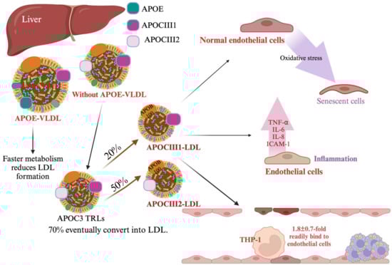 APOC3 is increasingly recognized as a key factor associated with atherosclerosis despite its presence in LDL in small amounts [85,86,87]. In the typical lipoprotein cycle, APOC3 found on LDL primarily originates from APOC3 on VLDLs through metabolic processes [88]. Mendivil et al. highlighted that APOC3 not only participates in metabolic cycling but is integral to regulating lipid metabolism rates in physiological circulation [89]. Additionally, a study by Zheng et al. [84] revealed that APOC3-containing TRLs lacking apoE undergo faster metabolism, with many of these particles ultimately converting to LDL. In contrast, TRLs with apoE undergo rapid clearance, reducing LDL formation. This differentiation in APOC3 and apoE’s roles underscores their distinct impacts on TRL metabolism and LDL generation, affecting cardiovascular health risks [87]. Importantly, APOC3-lacking LDL does not promote adhesion molecule production in endothelial cells or damage these cells. In contrast, APOC3-containing LDL adversely affects endothelial function (Figure 4) [86]. Mendivil et al. estimated that approximately 10%–20% of LDL particles carry APOC3 [89], with APOC3-containing TRLs representing the primary precursors to LDL. In the conversion process, approximately 70% of APOC3-containing TRLs ultimately transition to LDL, forming the following two subtypes: E2CIII1 LDL (20%) and E2CIII2 LDL (50%) [87]. Regression analysis has shown that APOC3-containing LDL elevates CVD risk by an estimated 138% compared to non-APOC3-containing LDL [89]. Recent findings suggest that electronegative LDL (L5) presents an even greater CVD risk than other LDL subtypes, promoting inflammation and atherosclerosis progression [90,91,92]. L5, an LDL subtype with significant APOC3 content, has emerged as a focal point in CVD risk assessment and prevention strategies [93]. The mechanisms underlying the impact of APOC3-containing LDL on cardiovascular health remain to be fully elucidated; however, evidence suggests that it contributes to oxidative stress-induced endothelial damage and senescence, mediated through the reactive oxygen species/F-box only protein 31 (FBXO31) signaling pathway [94]. Studies have further observed increased serum levels of APOC3-containing LDL in high-fat diet-fed hamsters, suggesting a possible dietary influence [94]. In diabetes research, APOC3 has been shown to influence LDL binding. Importantly, the apoB protein in LDL contains a specific binding site (site A) that interacts with proteoglycans such as biglycan [86]. The presence of APOC3 modifies LDL structure, enhancing its propensity to bind proteoglycans, potentially leading to LDL accumulation in vessel walls. This accumulation activates endothelial and immune cells, which release inflammatory factors, exacerbating vascular damage and disease progression. Notably, of the three isoforms of APOC3, only apoCIII2 within LDL has been implicated in triggering inflammatory responses in patients with diabetes, including the production of interleukin (IL)-6, TNF-α, and IL-8 [86]. This finding underscores the pivotal role of apoCIII2 in vascular inflammation and highlights its impact on cardiovascular health and diabetes complications. Studies have also linked less-dense LDL, frequently elevated by high-carbohydrate diets, to slower VLDL clearance—a process partially influenced by APOC3 metabolism. Additionally, APOC3 glycoform sialylation alters its metabolism, such that it dissociates from less-dense LDL density patterns and elevated TG levels due to its faster clearance rate [95].