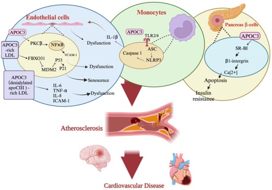 Functional damage of arterial endothelial cells is the key process causing atherosclerosis [96]. Human experimental studies have revealed that APOC3 is involved in atherosclerotic CVDs [97]. Inflammation of vascular endothelial cells is an important developmental cause of atherosclerosis, leading to endothelial cell dysfunction, which consequently attracts monocytes to the subendothelial space of the endothelial layer [98]. Monocytes differentiate into macrophages, which phagocytose oxidized LDL. Foam cells are formed by macrophages and accumulate in the intimal layer of the vascular wall [99]. Therefore, together with the proliferation and repair of smooth muscle cells, early atherosclerotic plaques are formed. As the sclerotic plaque gradually becomes larger, the lumen of the blood vessel narrows, resulting in insufficient blood supply and ischemic symptoms, which is known as “atherosclerotic CVD” [100]. In the inflammatory signaling cascade of NF-κB, APOC3 upregulates the expression of adhesion factors, such as intercellular adhesion molecules and VCAM [101]. It also promotes the adhesion of endothelial cells and monocytes [102]. However, treatment with statins reduces the inflammatory response and endothelial cell adhesion [103]. Under normal settings, inactivated endothelium cells exhibit significantly low levels of junctional adhesion molecule 1 (JAM-1) [104]. It has been found that APOC3 can increase the inflammatory factor TNF-α and subsequently stimulate the phosphatidylinositol 3-kinase signaling pathway, causing IκB kinase degradation and p-IκB⍺ and NF-κB signaling, resulting in the overexpression of JAM-1, also known as the F11 receptor [105]. The F11 receptor is a cell adhesion molecule that selectively localizes to the tight junctions of endothelial cells [105]. According to Heiss et al., endothelial nitric oxide (NO) synthase (eNOS) is a key regulator of cellular processes that are necessary for preserving endothelium homeostasis [106]. Reduced eNOS activation and NO release into the medium are the results of the actions of APOC3 [107]. FBXO31 plays an important role in cellular senescence and has properties similar to those of a tumor suppressor [108]. APOC3-rich LDL induces oxidative stress and expression of cellular senescence factors, such as p53/p21 and FBXO31/p-murine double minute 2, resulting in the aging of human aortic endothelial cells [94] (Figure 5, Table 1).