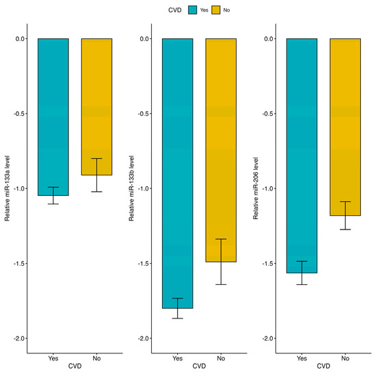 We then examined whether the levels of circulating miR-133a-3p, miR-133b, and miR-206 were associated with CVD diagnosis. As shown in Figure 1, the expression levels of miR-133b and miR-206 were significantly lower in CVD samples than in control subjects (p < 0.05).