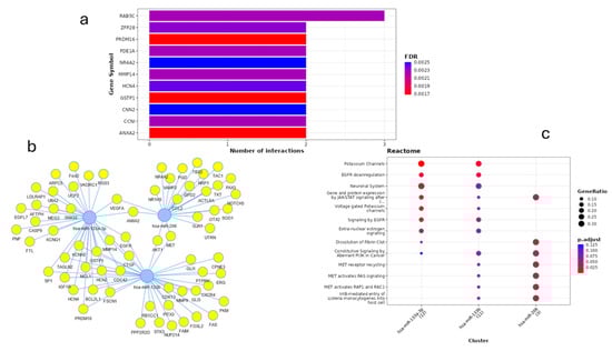miRNA–target enrichment analysis by MIENTURNET. (a) Bar plot of the results of the enrichment analysis obtained as obtained from miRTarBASE. On the Y-axis are the top-ranked target genes of the submitted miRNAs, while the X-axis represents the number of miRNAs targeting them. The color code reflects the adjusted p-values. The threshold for the minimum number of miRNA–target interactions was set up to 1; (b) Graphical representation of the network of miRNA–target interactions identified by the enrichment analysis; (c) Functional enrichments for miRNA target genes according to REACTOME. Dots are colored by p-adjusted value (FDR) and sized by gene ratio per pathway (i.e., the number of miRNA targets found enriched in each category over the number of total genes associated with that category).