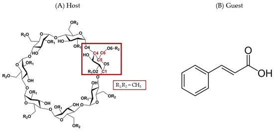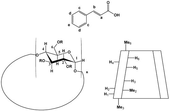 To confirm the clues we obtained from in silico studies, we conducted further experimental studies by means of nuclear magnetic resonance (NMR). One of the most suitable methods for the quantification of non-covalent molecular interactions is 1H-NMR spectroscopy, which also enables us to obtain information about inter- and intramolecular interactions between atoms of the host and guest molecules [60,61,62]. At the same time, the observed chemical shift changes (Δδ) provide insight into the structure of the complexes. To better understand the interactions between the guest and the host, the structure of the CA and the schematic representation of the RAMEB are shown in Figure 10.
