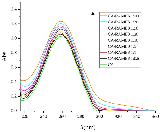 The complexation was studied by UV-vis titration. The spectra of free CA and with increasing concentrations of RAMEB are shown in Figure 3.