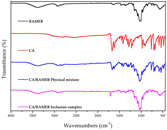 FT-IR spectra of the CA/RAMEB inclusion complex compared to the free components and the physical mixture.