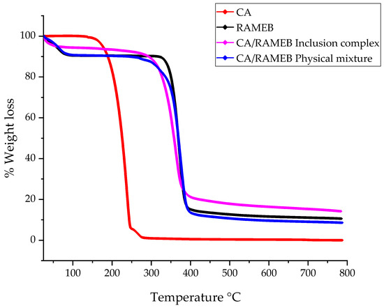 TGA thermograms of the CA/RAMEB inclusion complex compared to the free components and the physical mixture.