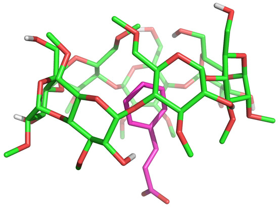 The RAMEB model was built using Maestro [69] upon a β-cyclodextrin crystal structure (CCDC entry 762697) [70]. RAMEB was modelled, analogously to previously reported studies [71], by adding 4 methyl groups at O2 positions of 2, 3, 4, and 6 glucopyranose units, 5 methyl groups at O3 positions of 1, 2, 4, 5, and 7 glucopyranose units, and 3 methyl groups at O6 positions of 1, 5, and 7 glucopyranose units.