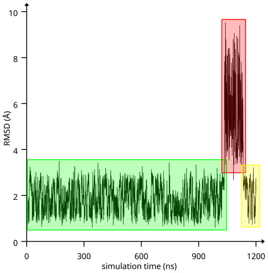RMSD of CA and RAMEB heavy atoms as a function of simulation time. Low RMSD simulation time windows are highlighted in green and yellow, while the red area highlights the high RMSD simulation time window.