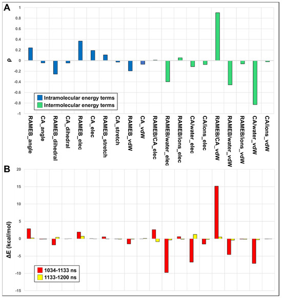 It clearly appears that the complex is mainly stabilized by intermolecular Van der Waals (VdW) interactions between CA and RAMEB (Figure 9). Indeed, considering that complex dissociation relates to high RMSD values, it is evident, from the RMSD/energy term correlation values, that when CA unbinds from RAMEB, RAMEB/WATER electrostatics and RAMEB/WATER and CA/WATER VdW interaction energies become more favorable, but this energy gain is coupled to a significant loss of favorable RAMEB/CA VdW energy (Figure 9A). This can be highlighted even in the energy differences found between the 0 and 1034 ns; 1034 and 1133 ns; and 1133 and 1200 ns simulation time windows (Figure 9B), where ΔE values show that in the 1034–1133 ns time window, when CA and RAMEB are dissociated (1034–1133 ns—red bars in Figure 9B), both electrostatic and VdW interaction energies of CA and RAMEB with the solvent become more favorable to the detriment of CA/RAMEB VdW and electrostatic energy. When the complex is instead associated again in the 1133–1200 ns time window (yellow bars in Figure 9B), the E values tend to revert back to the values observed in the 0–1034 ns time window.