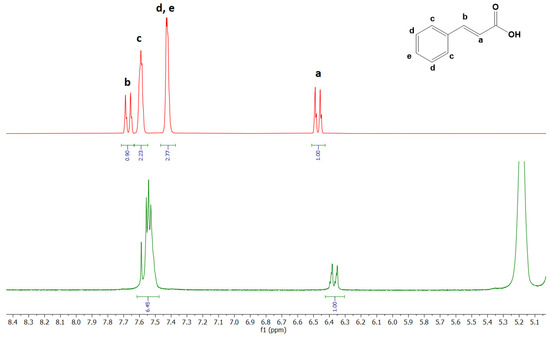 Stacked portions of 1H-NMR spectra relative to free CA (red spectra) and CA/RAMEB inclusion complex (green spectra). Full spectra are reported in Figures S1–S3.