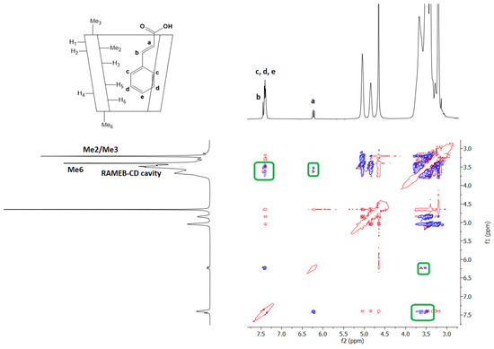 The postulated complexation of CA with RAMEB was also demonstrated via NMR spectroscopy using rotating frame Overhauser effect spectroscopy (ROESY) experiments, where if two protons from different compounds are in the spatial vicinity within 3–5 Å, an ROE cross-peak is observed in the 2D ROESY spectrum (Figure 12 and Figure S4). The ROE cross-peaks between the olefin protons H-a, H-b, and aromatic protons of the CA with the RAMEB internal cavity confirm the complexation. Furthermore, the absence of ROE cross-peaks between olefin and CA aromatic protons with Me3 of RAMEB confirms the in silico-predicted orientation of CA into the inclusion complex.