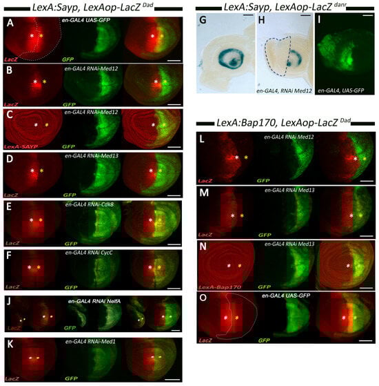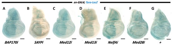 Control experiments were performed to test the knockdown efficiency. We used the Ms1096-GAL4 wing disc driver with a well-defined expression pattern to visualize the efficiency of the Med12 knockdown. Staining showed efficient depletion of Med12 according to the driver expression pattern (Figure S2A), indicating that the knockdown was efficient. Expression of the fusion protein LexA–Bap170 remained intact upon Med12 depletion in this system (Figure S2B), like with the en-GAL4 driver. Examination of the Med13 expression pattern in wing discs after a Med13 knockdown with en-GAL4 in the posterior region confirmed the knockdown efficiency; i.e., much weaker staining with antibodies to Med13 was observed in the posterior region (Figure S2C). Moreover, the fly stocks expressing hairpins against the Med12, Med13, and Nelf-A mRNAs were used in other studies [,,]; the fact further underlines the specificity of the knockdowns used. To study the knockdown efficiency of the Cdk8 and CycC subunits, we used their known target gene E(spl)mβ because appropriate antibodies were unavailable []. Both Cdk8 and CycC knockdowns using the en-GAL4 driver decreased the expression of the target gene in the particular region of driver activity (Figure S2D–F).